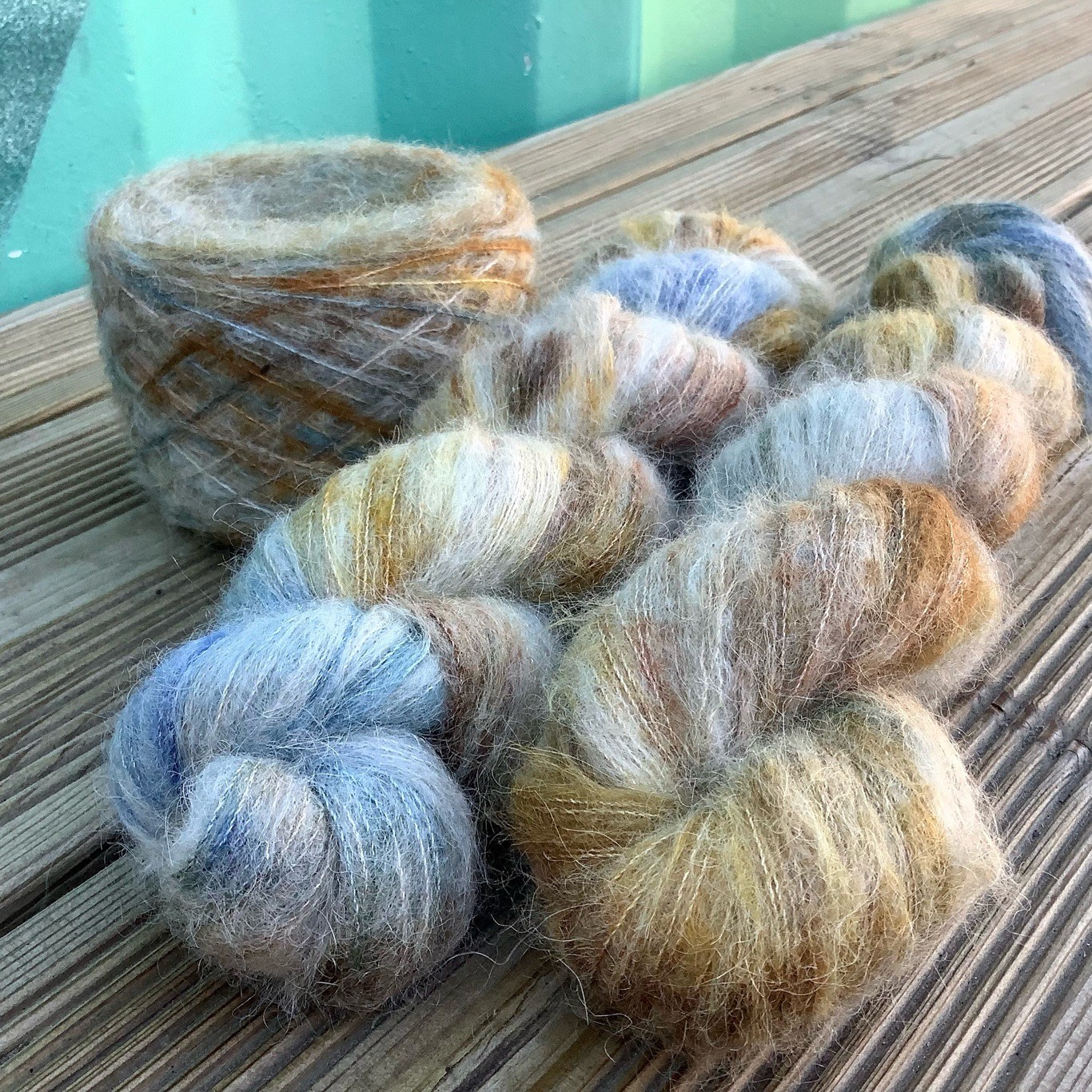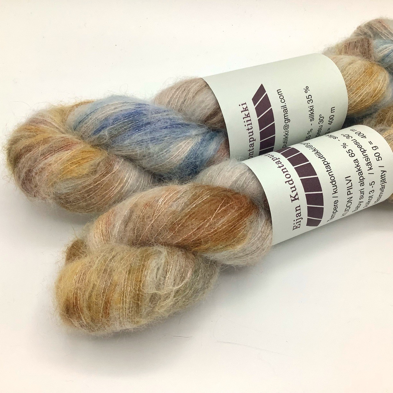 Tämä ihana pörröinen lanka on täydellinen vaihtoehto niille, jotka eivät pidä mohairista. Lanka on superpehmeää baby suri alpakka 65 % ja silkki 35 %. Käsinvärjätty ja värit näyttävät pehmeiltä. Väreinä sinisen, okrankeltaisen ja ruskean sävyjä.